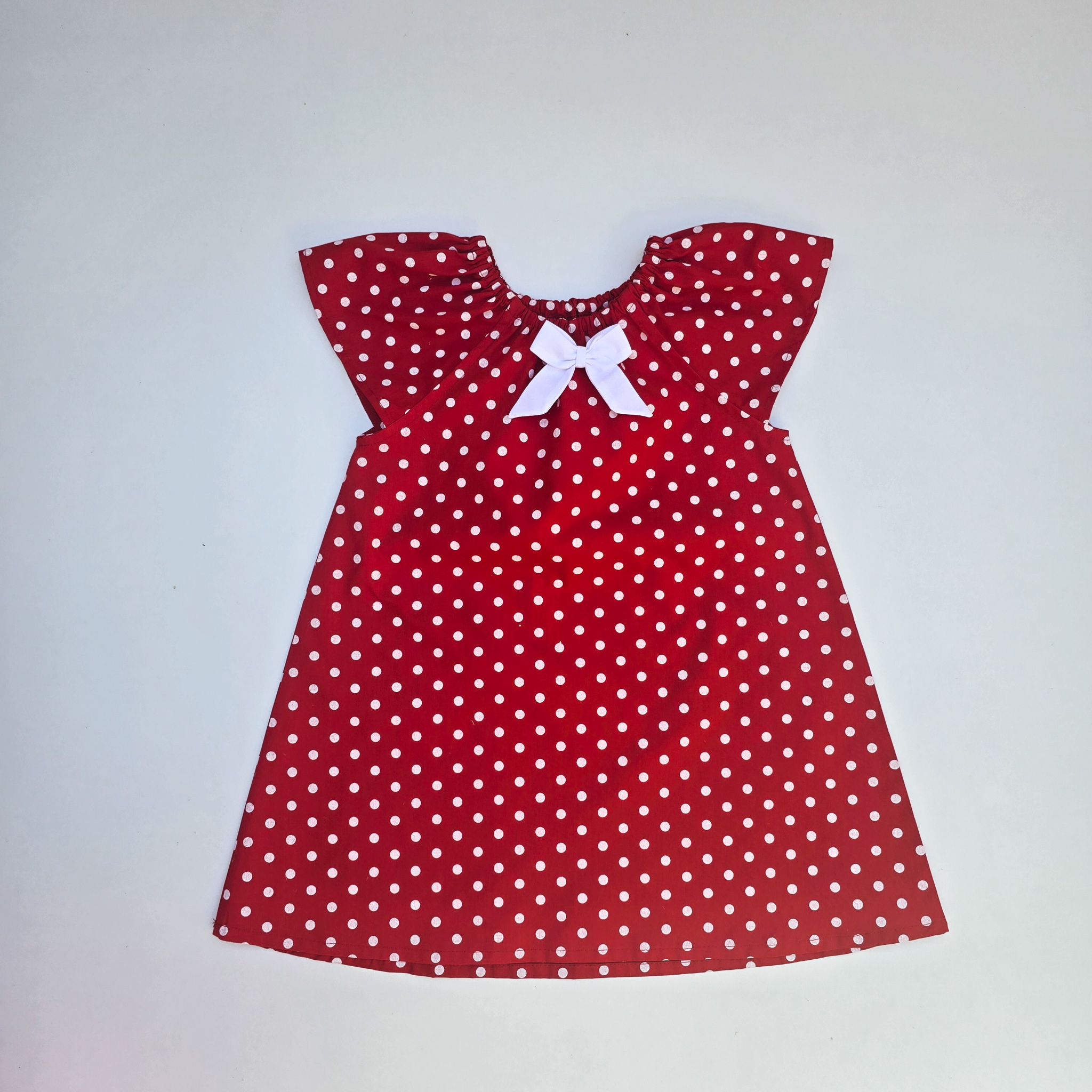 Na cor vermelha com poa branco, esse modelo é uma mistura de um visual clássico com o despojado, o Vestido Carol é ideal para passeios especiais, festinhas ou momentos simples cheios de ternura.